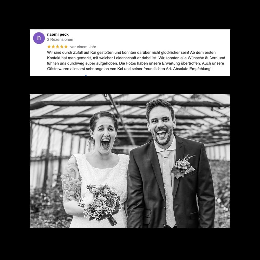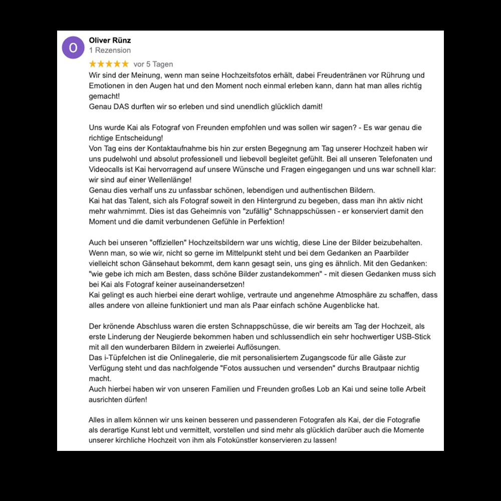 Ich freue mich schon jetzt auf Eure Nachricht ein paar Wochen nach Eurer Hochzeit, die ganz oft in etwa so klingt:  "Hallo Kai, die Bilder sind ein Taum 😍 Vor allem all die Momente die du erfasst hast... unbeschreiblich mir kamen die Tränen als wir uns die Bilder angeschaut haben. Wir danken dir 🥰"